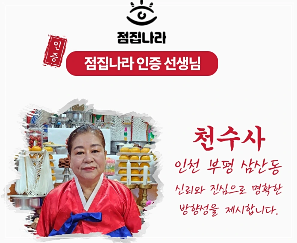 - 맞춤형 상담으로 신뢰 구축 천수사는 고객의 사정과 고민을 이해하며, 친절하고 따뜻한 상담을 통해 신뢰를 쌓아왔습니다. 특히, 중요한 선택의 기로에 선 고객들이 천수사를 찾아와 답답했던 마음을 풀고, 새로운 방향성을 찾는 데 도움을 받고 있습니다.